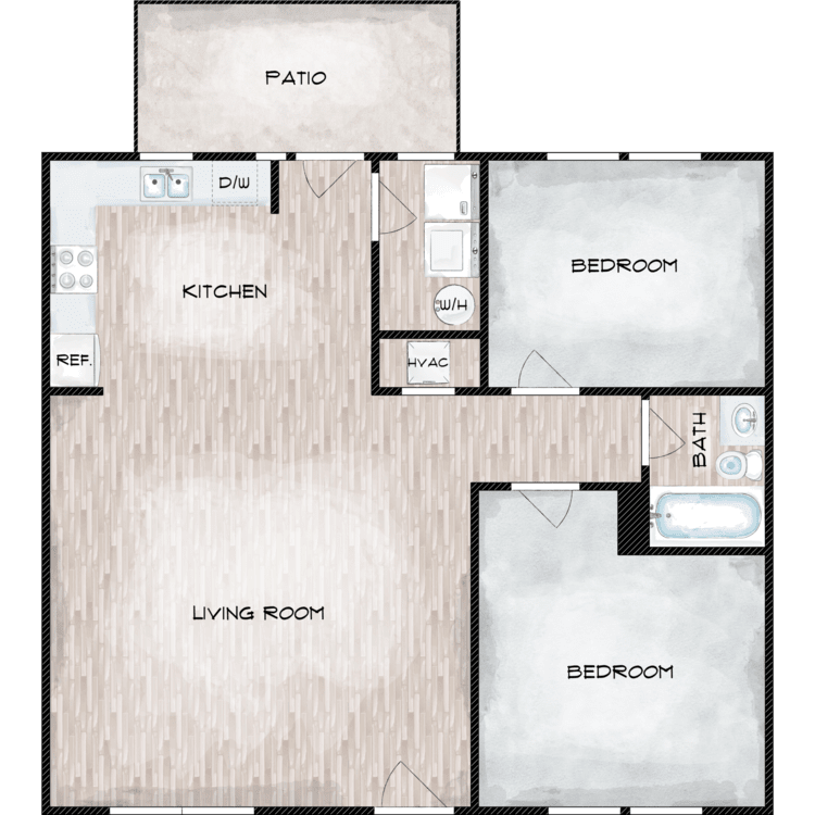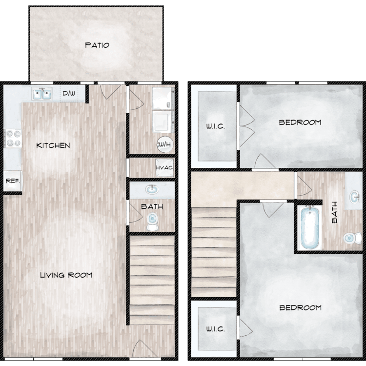 Our two-bedroom garden-style apartments and two-bedroom townhomes for rent feature a curated collection of amenities. Delight in spacious, modern kitchens with pantries, contemporary appliances, and breakfast bars in the townhomes, designed for everyday living and entertaining. Balconies and patios frame scenic wooded views, while bright, open-concept interiors highlight wood-plank laminate flooring, vaulted ceilings, plush carpeting, and full laundry rooms with washer and dryer connections. Storm doors, central heating and air, and abundant closet and storage space enhance daily comfort, with townhomes offering ceiling fans and walk-in closets for an added layer of style and ease.